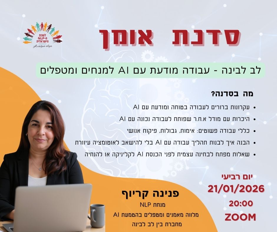 ימים שעות דקות שניות יום רביעי 21/01/2026 | 20:00-21:30 | בזום כניסה ל ZOOM כניסה לקבוצה השקטה כדי להירשם, אנא מלאו את הטופס ועברו לקבוצת וואצאפ שקטה של הסדנה מה נלמד בסדנה? בסדנה נעמיק בדרך עבודה מעשית ומודעת עם בינה מלאכותית בעולמות ההנחיה, הטיפול וההתפתחות האישית.מדובר בתהליך שמראה איך לעבוד עם AI מבלי לאבד שיקול …